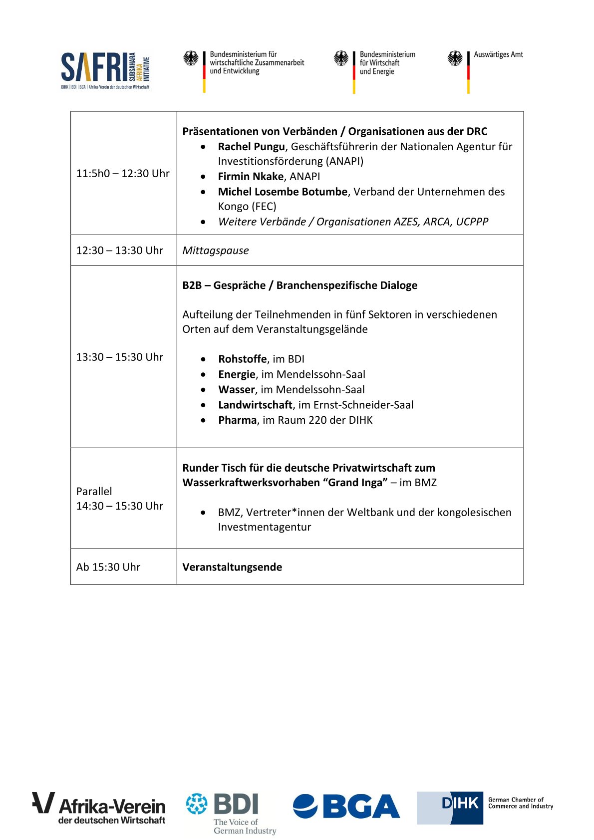 Wir freuen uns auf den Austausch zwischen deutschen und kongolesischen Akteuren zu Investitions- und Kooperationsmöglichkeiten in den Bereichen Rohstoffe, Energie, Wasser, Landwirtschaft und Pharma.