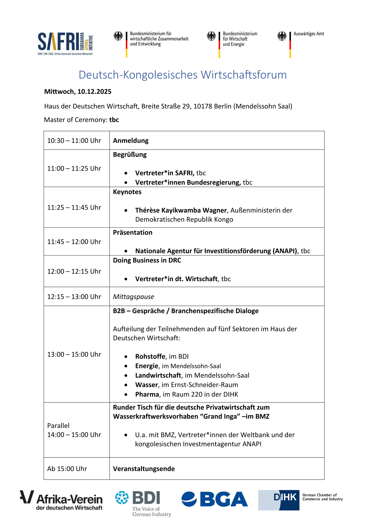 Die Veranstaltung richtet sich an Unternehmen, Investoren und Entscheidungsträger, die wirtschaftliche Partnerschaften mit der Demokratischen Republik Kongo aufbauen oder vertiefen möchten.